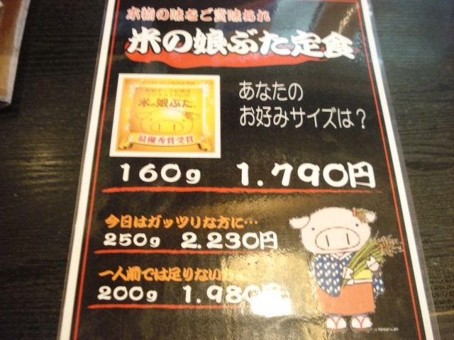 米の娘ぶた定食というのがあり、160gが1,790円、200gが1,980円、250gが2,230円。
