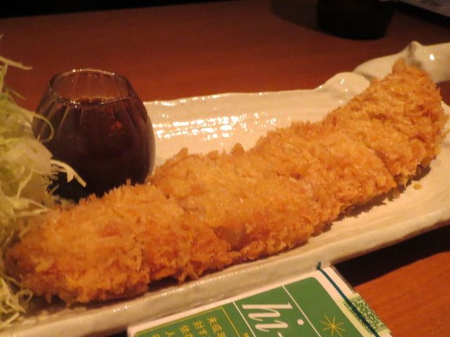 このお店は、お洒落な雰囲気で、お酒はワインが主体の一見「女性向け」ともとれますが、このスーパージャンボサイズのバラカツは断然「男の中の男向け」です。
