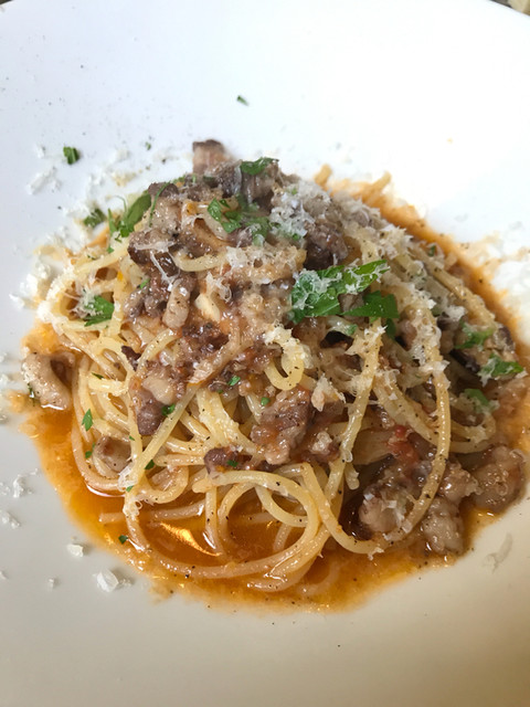 千歳産イノブタと美瑛産椎茸のラグーソーススパゲッティ
