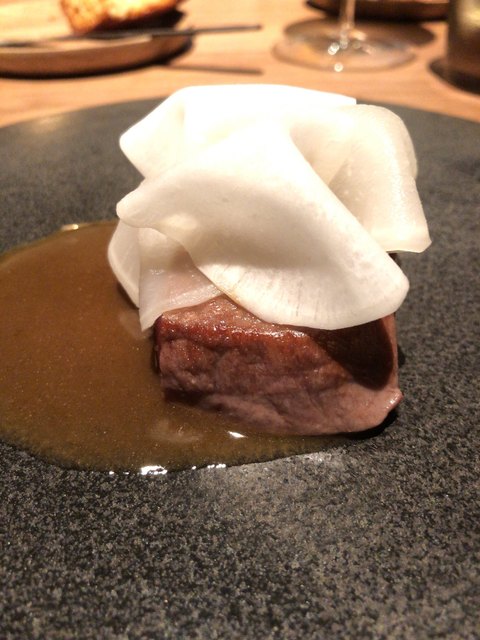 「しんしん」という部位のお肉で、薄くスライスしたカブが載っています。