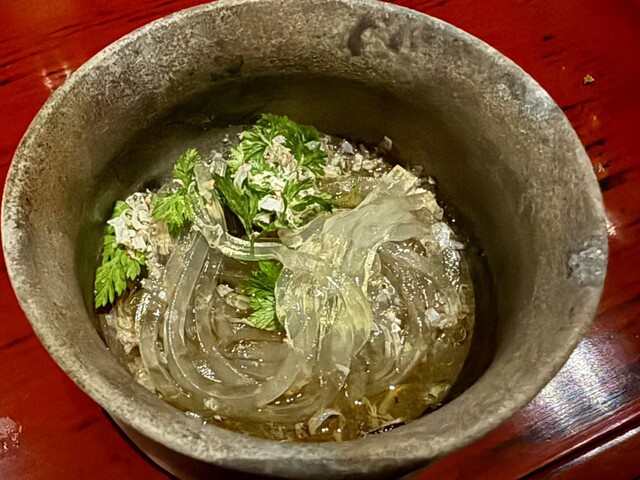 六品目は「ところてん タコぶし」で、箸休め。魚や肉をここでリセット。タコのカツオ節、タコぶしを初体験。