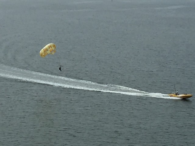 眼下に見える浜名湖では今、一番やってみたいパラセーリングをやっています。
