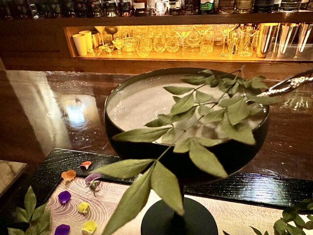 京都産バジルとカフィアライム、柚子のレモネードは葉を液体窒素でバリバリのフリーズドライにして、レモン果汁、柚子の皮を入れてシェイク。金箔を散らした和風カクテル。