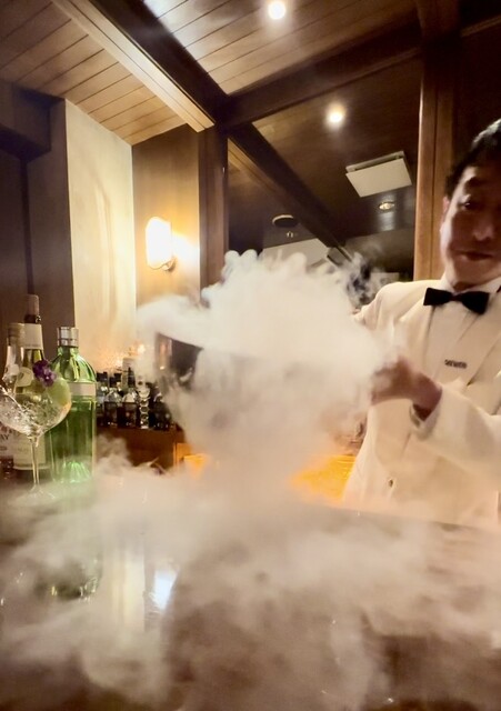 今日はシャインマスカットのシャーベットを目の前で液体窒素を使用して作るシャブリを注いで作るカクテルとノンアルカクテル。