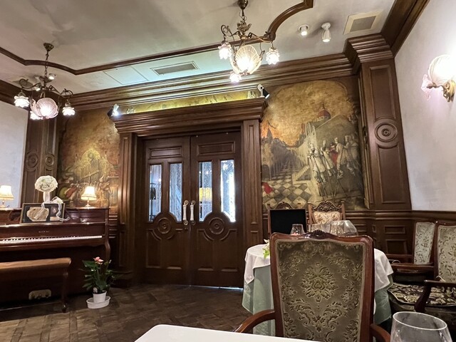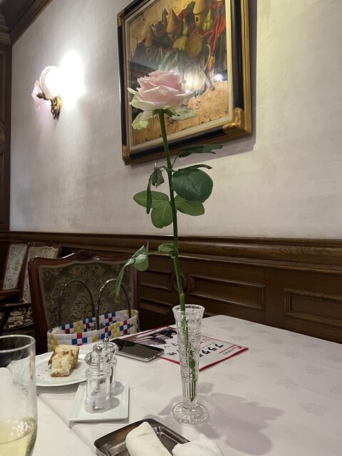 アイビィがつたう外観もいい。店内にはクラシカルな調度が立ち並び、ゴージャスなサイズの絵画たちが迎えてくれる。姫路のお気に入りのフレンチレストランだか、この日は初めて日曜日のランチを味わった。まずは、泡もので乾杯。二杯目は料理に合わせてオーナーにワインをセレクトしてもらうと、まず間違いない。