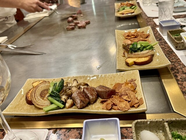 大阪新阪急ホテルB1のロイン。いままで何回来ただろうか。ロインはたくさんお店があるが、どこの店のステーキも鉄板の焼き物も間違いなく美味い。前菜から魚介と野菜の焼き物に鉄板の上で白から黄色、そして茶色に変わっていくガーリックの香のなんとも香ばしいことか。