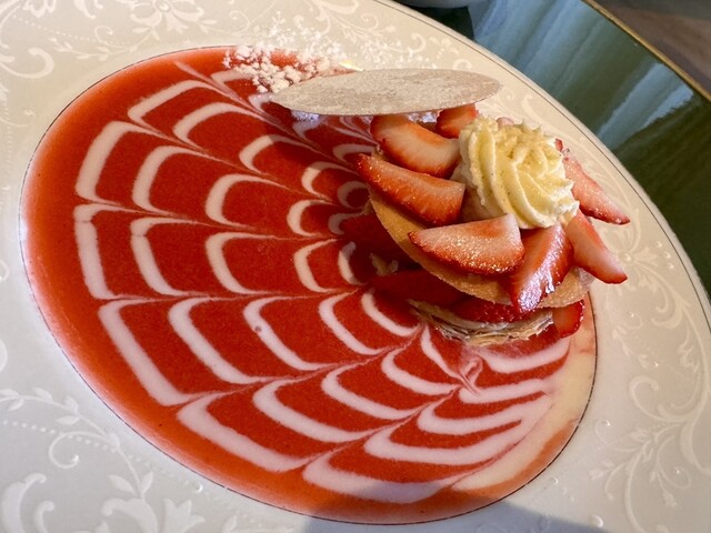まずはお目当てのデザートカフェへ。案内された2階の瀟洒な部屋で目にも美しい「苺のフィアンティーヌ」をコーヒーとセットでいただいた。気品あふれるゆったりとした席で、調度品やしつらえを楽しみながら優雅に過ごす至福のひととき。