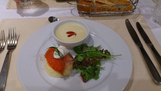 オードブルは「ズワイガニのプリンとスモークサーモンのムース」。