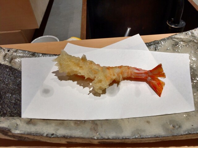 【車海老 1番目】いわゆる最上等の海老の天ぷら、と言ってもこれまで食べた中では最高峰ですが。ああこういう軽やかな衣なんだ、これが-50℃のパウダースノーの衣なんだと感心します。