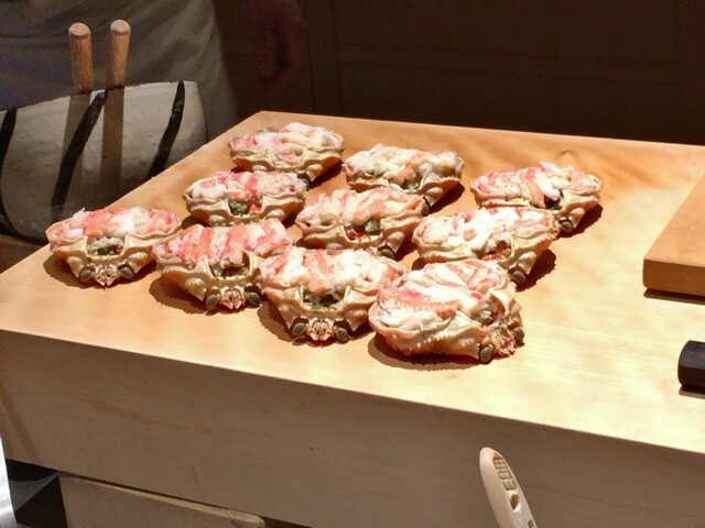【香箱】はじめ板場に置かれた立派な香箱を見て狂喜乱舞、勢子なのに越前の黄色いタグ付きです。肴として頂くのかと思いきやこのまま揚げると聞いてびっくり仰天、そんな豪勢なもの食べたことないです。