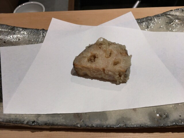【蓮根】愛西のものだと仰っていました。蓮根大好き、愛西にも買いに行くので嬉しいな。加賀蓮根のようにただただもっちりとするだけでなくしゃっきり感も損なわれていない丁度良い塩梅です。でもこれだけの厚みがこういう風に揚がる技ってすごいです、時間と油温の戦いですね。