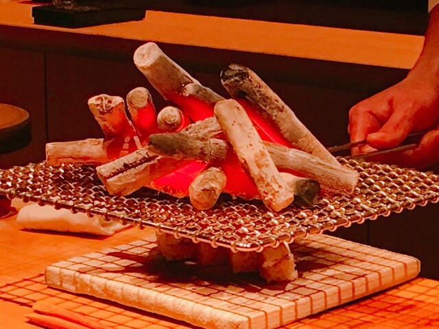 静かに赫赤と色を成す備長炭を上からかざし銀皮に焼き目が付けられていきます。