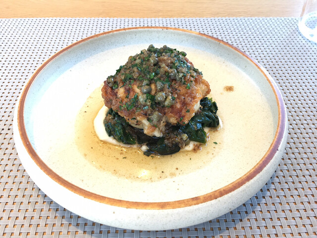 厚く立派なソテーは素晴らしい火入れで今まさにレアが終わった状態、客席へ運ぶ時間を逆算して火を止めていらっしゃるのでしょう。