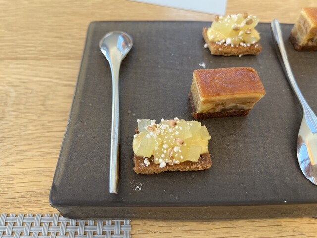 添えてあるエンドウ豆はシェフとスーシェフで一粒づつ薄皮を剥かれるのだそう、その気の遠くなるような丁寧さに感謝して頂きました。