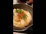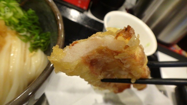 うどんそのものの味を楽しんでから、アツアツサクサクの天ぷらをうどんにのせます。