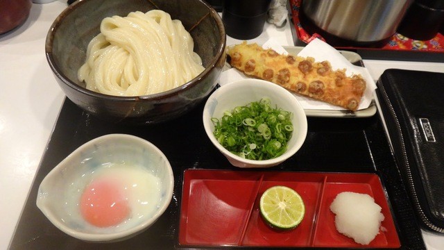 梅田で一番旨いと思ううどん屋で釜玉にちくわ天トッピング。炭水化物ダイエットは失敗だけど、満足の一杯。