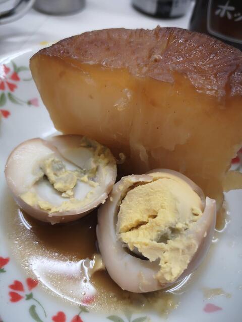 名物の煮込みと煮玉子を頼みます。個性的な味の煮込みと、好物の煮玉子がクイックに出て来ます。