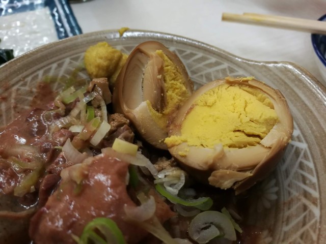 煮込みの玉子にも箸を入れます。大好物なので、後回しにしたのです。