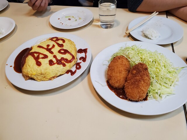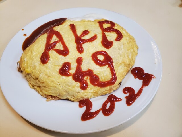 続いては、超ジャンボな名物オムライス。お茶目なご主人がいつもケチャップでいたずら書きをしてきます。今日は「AKB49 2023」と書かれていました。その心は不明ですが(笑)