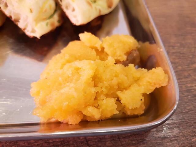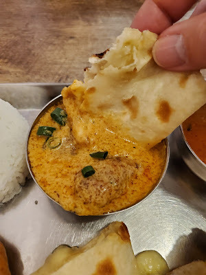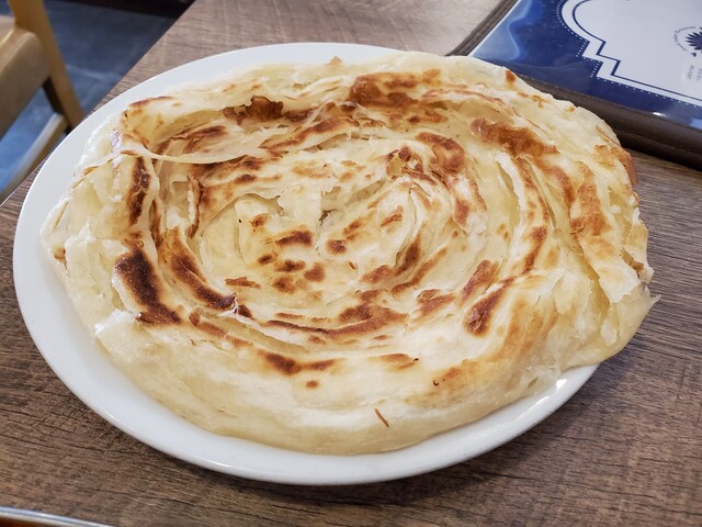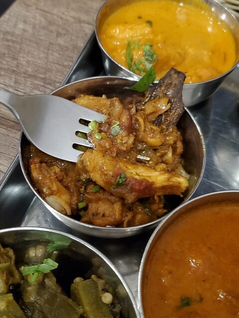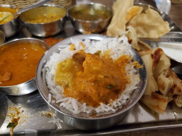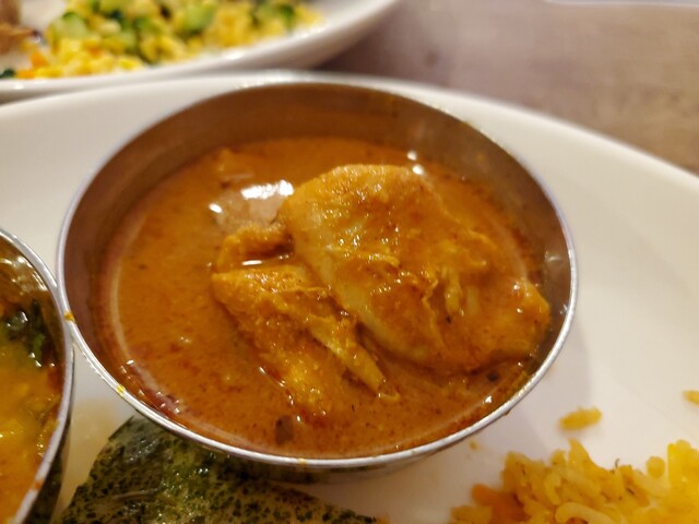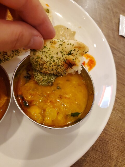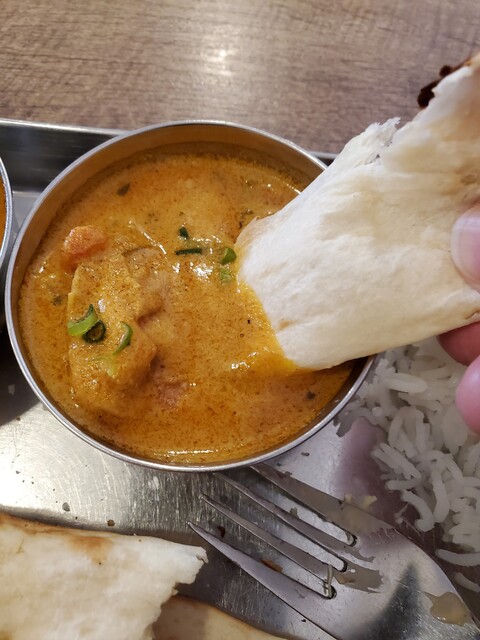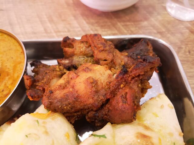 塩味の強いのがナンディニのバターチキン。メティ・クルチャをディップして頂きます。メティ・クルチャはメティ(フェヌグリークの葉)を具材として生地に練り込んだり包み込んだりして焼いたインドのパン(クルチャ)。ナンと違ってふっくらしています。