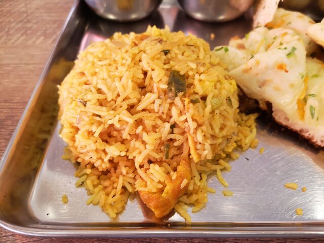 一見ビリヤニ風のエッグライスはチキンとクラッシュした玉子焼きが入っています。