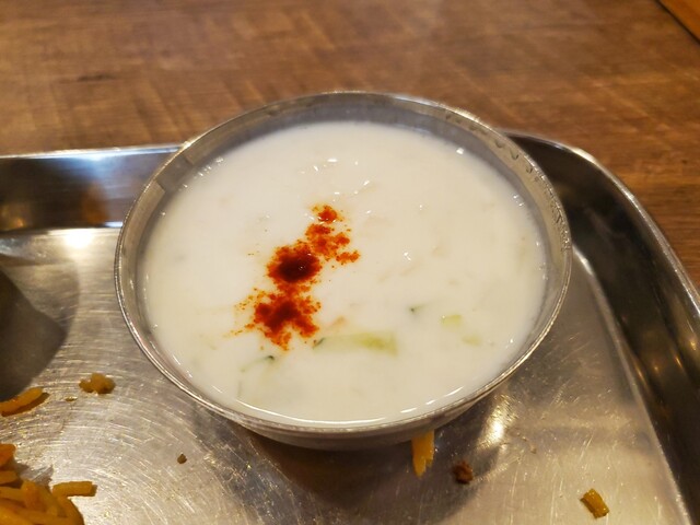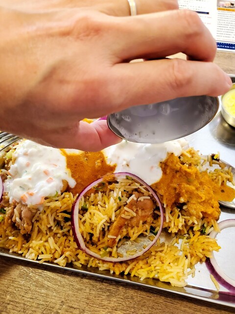 ライタの酸味で刺激が少し中和されます。ビリヤニ、カレー、ライタを好みに混ぜ合わせて食べるのが南インドスタイル。