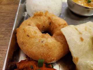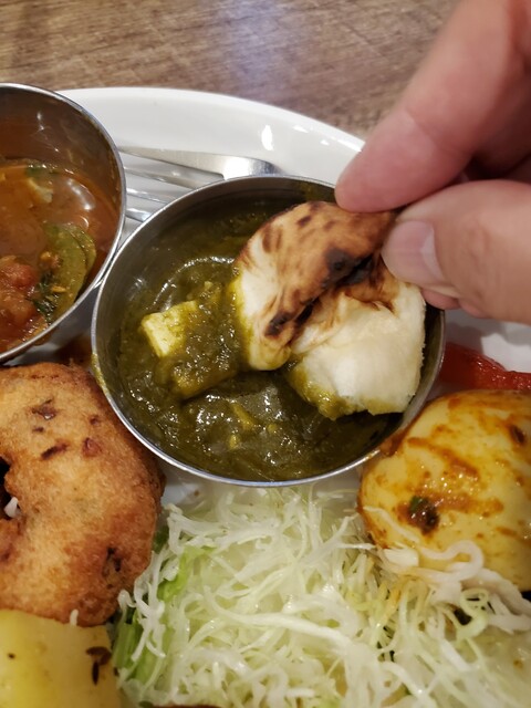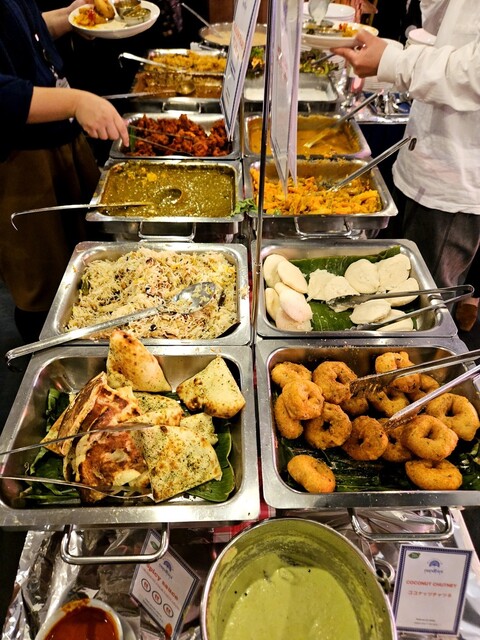 私は手前のサラダから時計回りに半分の5種類をプレートに取り、後半は反対側の5種類を取るというのが基本のスタイル。最初はコサンバリ(サラダ)、ライタ、サンバル、ベジ・ジャルフレージ(野菜のスパイス炒め)、ウディンワダ(ドーナツ型の豆粉の揚げパン)、イドゥリー(ライスケーキ)。ココナッツチャットニーも添えて。