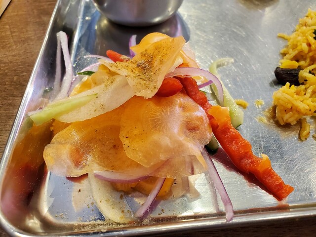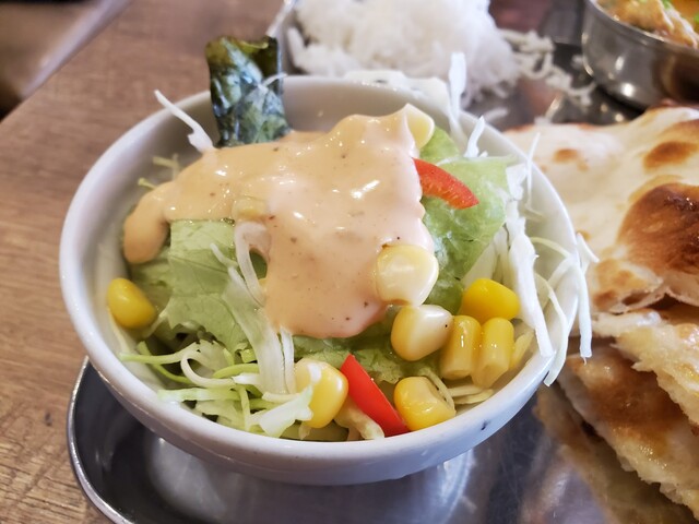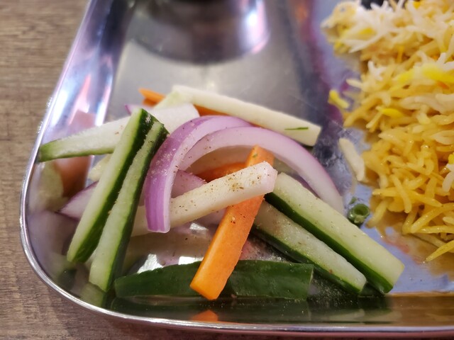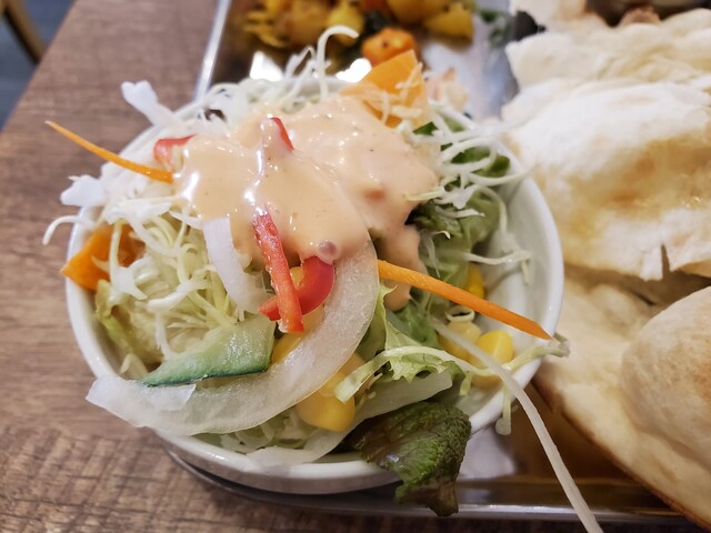 実にラッキー。早速いつも通り時計回りにサラダから半分の料理をワンプレートに取っていきます。ミックスチャット、ライタ。