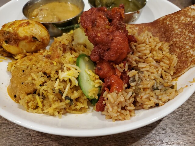 レギュラーメニューのビリヤニを食べる時と同様、カレーやスープ、ライタなどをかけて、好みの加減で混ぜ合わせて食べ進みます。この食べ方が南インドスタイル。