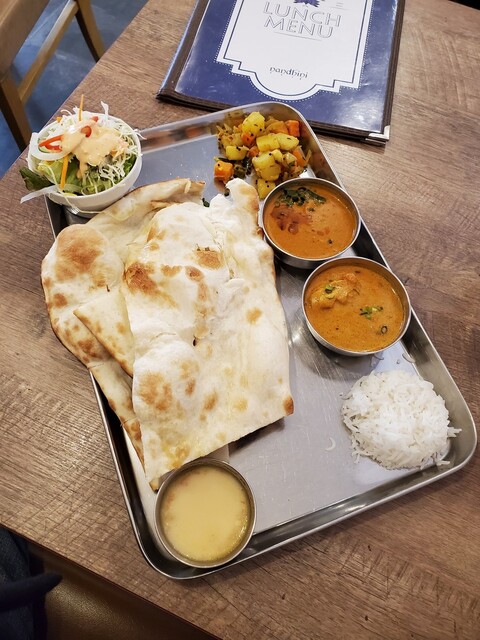 私が頼んだ「秋の4連休スペシャル」はボリューム満点。カレー三種類にエッグライス、クルチャ、タンドリーチキンというラインナップで1,700円。センターには屹立したパパッドが。