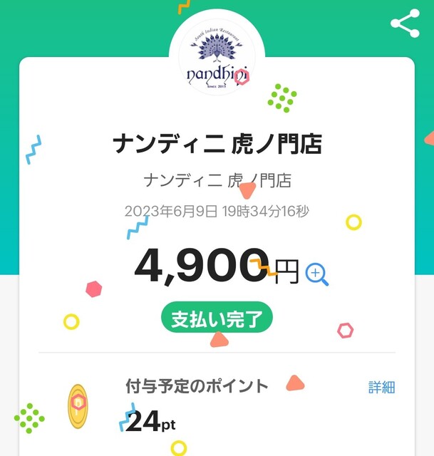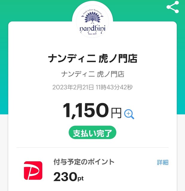 最後はお腹いっぱいで、ドリンクまでは頼みませんでした。お支払いはPayPayで。キャッシュレス決済だと1,650円のビュッフェが1,700円になるのですが、今月は港区のPayPay還元キャンペーンで10%ポイントバックですから、結局はお得。いずれにしても、コスパ最高のナンディニビュッフェです。