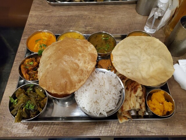 第二ラウンドは残りの半分の料理をワンプレートに取ってきます。ジャンル別に料理が並ぶ順番もだいだい毎回同じです。メティ・クルチャ、ベジタブルハンディマサラ。ベジタブルハンディマサラは、様々な野菜をスパイスの効いた濃厚なグレービーソースで煮込んだカレーです。「ハンディ」とは口が広く底が深い素焼きの調理鍋(壺)を指し、この伝統的な鍋を使って調理すること、あるいはそのスタイルの料理全般を「ハンディ」と呼びます。