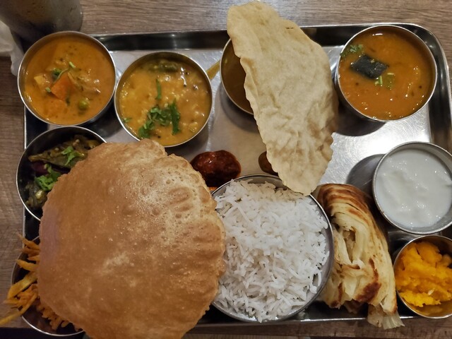 ミックスチャートというひよこ豆のスパイシーなサラダ、ライタ、オニオンボンダというフライ、野菜の甘みを感じるベジコットゥーというスープ、バターの風味が美味しいベジタブルシチュー、そしてミニドーサをワンプレートにのせました。
