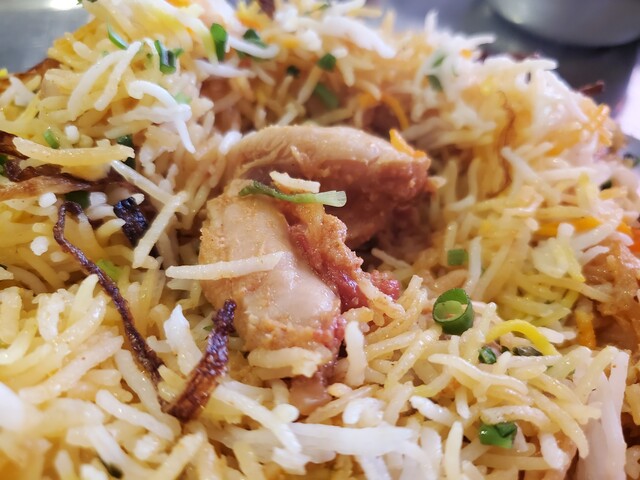 インドのケララ州マラバール地方発祥のビリヤニには大きなチキンがゴロリと入っています。しっとりとした食感。