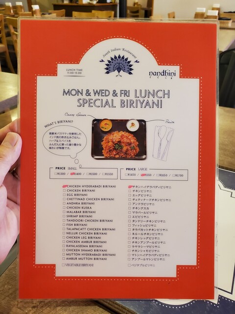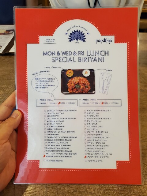 豊富なビリヤニメニューがあるナンディニですが、今日のビリヤニはマラバールチキンビリヤニに印が付いていました。マラバール地方(主に南インド・ケララ州北部)の料理は、スパイスが豊富なことからスパイシーな料理で知られています。サイズはレギュラーでオーダー。昔は大盛を食べていましたが、さすがに無理になってきたのです。