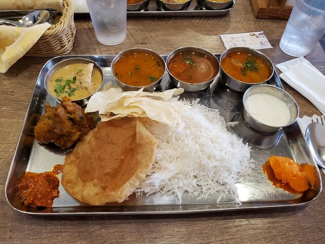 食べ終わった頃に料理が出てきます。息子が頼んだ「シェフセット」。カレーが三種類にドーサとポロッタ、タンドリーチキン、チャットニ—がついて1,450円。