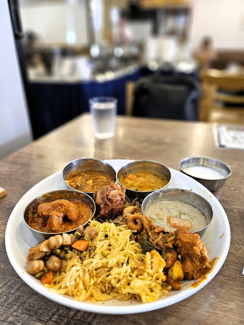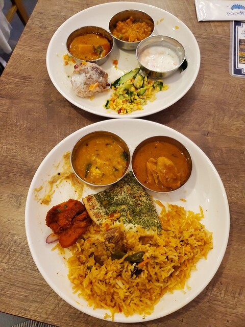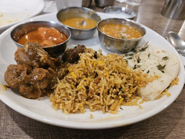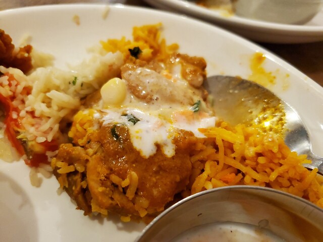 三回目は好きなものだけ取ってきます。チキンビリヤニとカシミールパラウの二種類のライスにマトンカレーとサンバル、チキンカバブをワンプレートに。