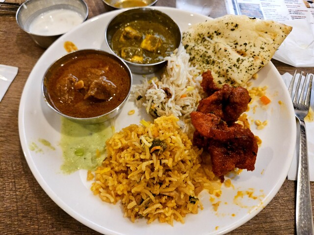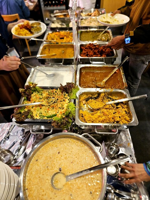 後半はメティ・クルチャ(具入りナン)、カシミールパラウ(炊き込みご飯)、パラクパニール(ほうれん草とチーズのカレー)、チキンカバブ、マトンプルス、チキンハイデラバディビリヤニ。好きなものばかりでテンションもアップ。