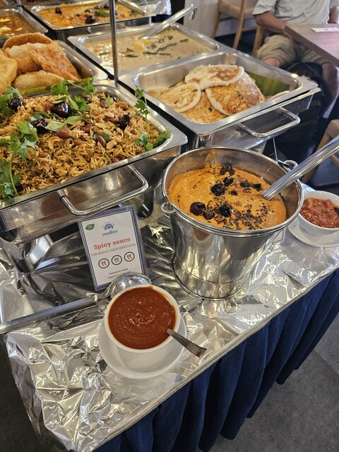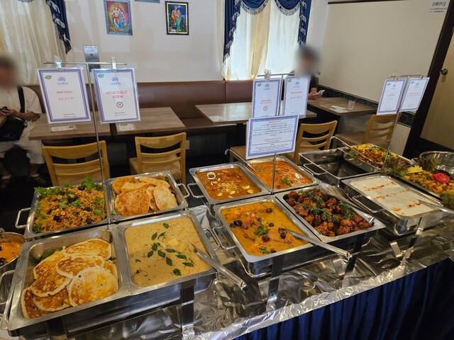 ここのビュッフェは11時~15時までですが、常に作りたてが補充されるので、何時に行っても品切れもなく温かい料理が頂けます。サラダ、サンバル、カレー、パン、ビリヤニ、炒め物など12種類の料理とチャツネ、デザートというのが基本ですが、毎回いろんな料理の組み合わせのビュッフェは、飽きることがありません。
