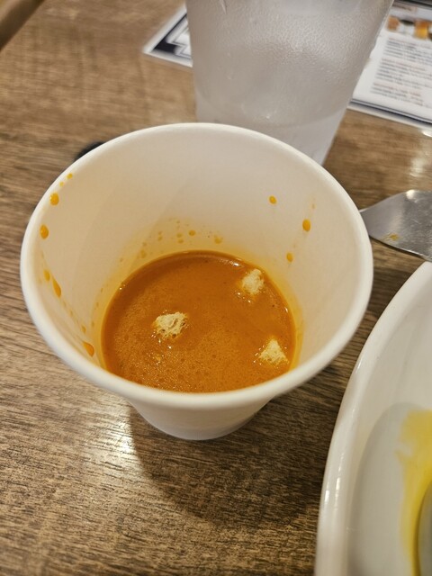SNSのメニューと見比べていて「スープがないな」と思っていたら、紙コップに入れて配られてきました。クルトンが浮いています。トマトスープですが、酸味よりも塩味の強いものでした。