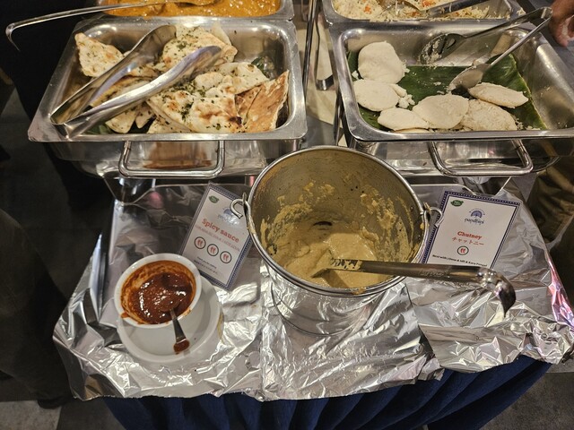 続いて入口から見て奥側に置かれているパンやビリヤニ、カレーやおかずを取ってきます。テーブルのエンドには大根のチャットニーとスパイスソースが置かれています。