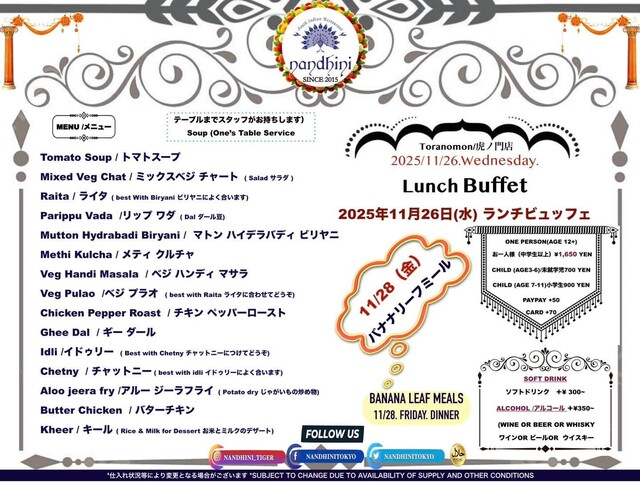 今日は所用で午前半休。うまい具合に大好きなナンディニ虎ノ門店のビュッフェランチの日です。基本的にはインドの祝日に合わせて開催されるのですが、イレギュラーもあり、今日は「ナンディニスペシャルランチブッフェ」というタイトルとなっています。