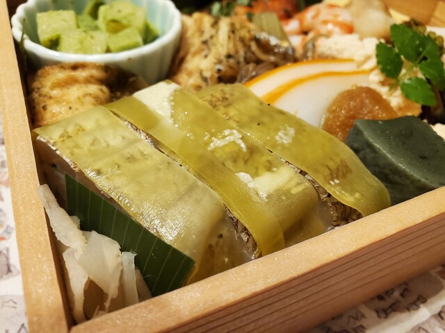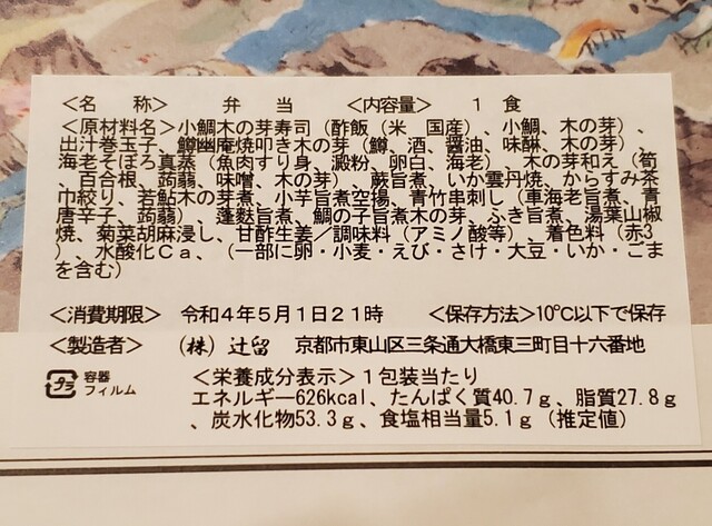 お料理は旬の食材を使った手の込んだものですから、料理人の説明が聞けないお弁当は、食品表示を見ながら食べるのが必須です。小鯛木の芽寿司、出汁巻玉子、鱒幽庵焼叩き木の芽、海老そぼろ真蒸、木の芽和え、蕨旨煮、いか雲丹焼、からすみ茶巾絞り、若鮎木の芽煮、小芋旨煮空揚、青竹串刺し、蓬麩旨煮、鯛の子旨煮木の芽、ふき旨煮、湯葉山椒焼、菊菜胡麻浸し、甘酢生姜とあります。懐石料理は一見して素材が判別しないこともままあるので、宝探し的な楽しみもあります。まさに宝石箱からの宝探し。
