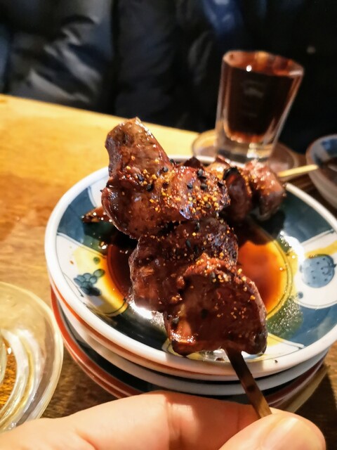 レバは、外はしっかり火が通っていますが、中は程よいレア。お酢や味噌に絡めて頂きます。お酢もかけない素焼きならではの楽しみ方。この為に生のお酢と煮込みのタレを残しておきました。お向かいさんが座らない奥席なのでお皿を重ねなくても迷惑にはなりません。