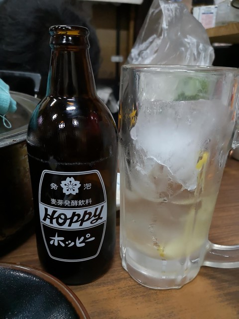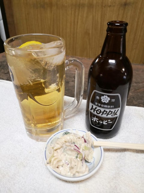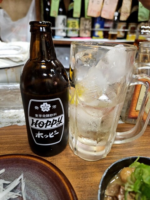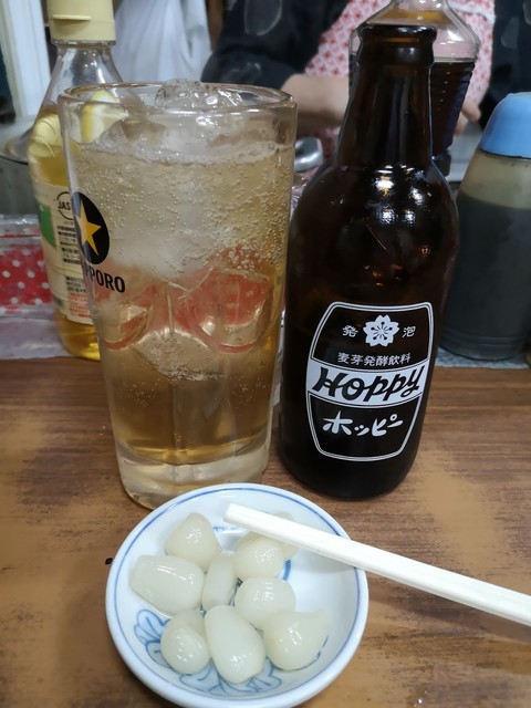 いつも混んでいるお店ですが、今日はすんなりカウンターに座ることができました。ドリンクはホッピー。
