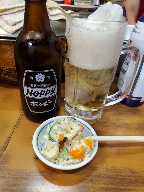 とりあえずホッピー。ここは黒が無いので白で。突き出しはポテトサラダ。