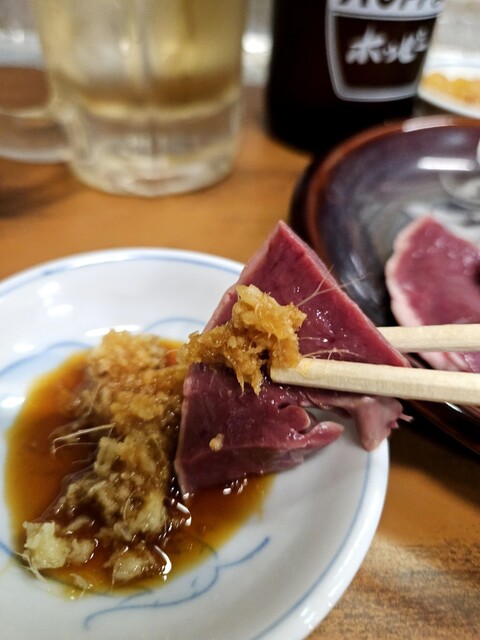 カウンターの一番手前に腰かけ、ホッピーとレバ刺しを頼みます。