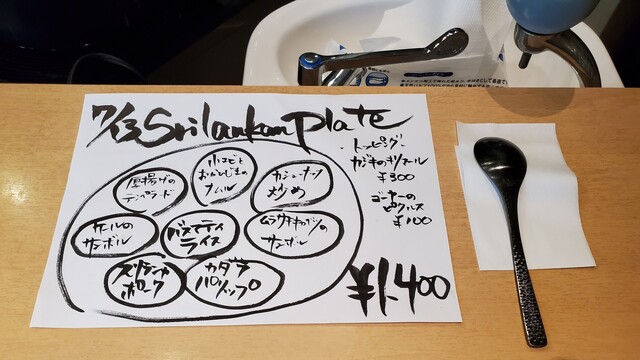 メニューは日替わりのスリランカプレート一種類。スリランカカレーといえば、ミールスと呼ばれるワンプレート定食が定番です。