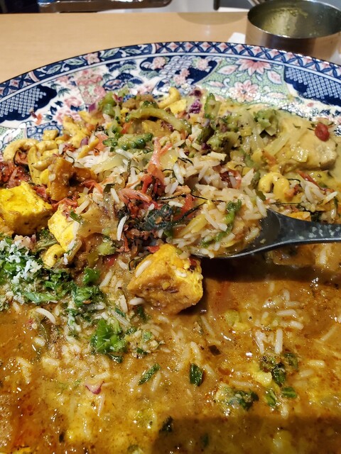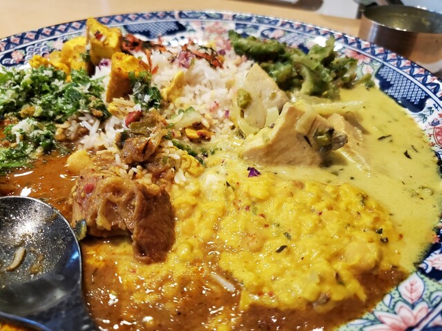 センターのバスマティライスの周りを取り囲むように彩り豊かなおかずが並んでいます。右からわさび菜のサンボル(和え物)、キャベツのマッルン(しんなり炒め)、ポルサンボル(ココナッツふりかけ)、オクラのテルダーラ(油炒め)、ムラサキイモのテンペラード(炒め煮)。どれも、手間がかかっていることは想像に難くありません。そして、3回目の訪問となる私は、この店の味の間違いなさはわかっているものの、同僚女性2人に自信満々に紹介した手前、彼女たちの反応も気になるところ。