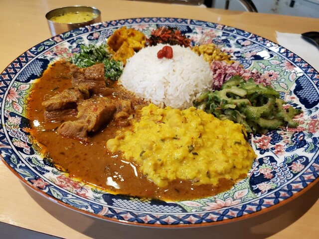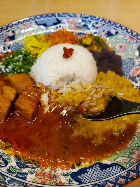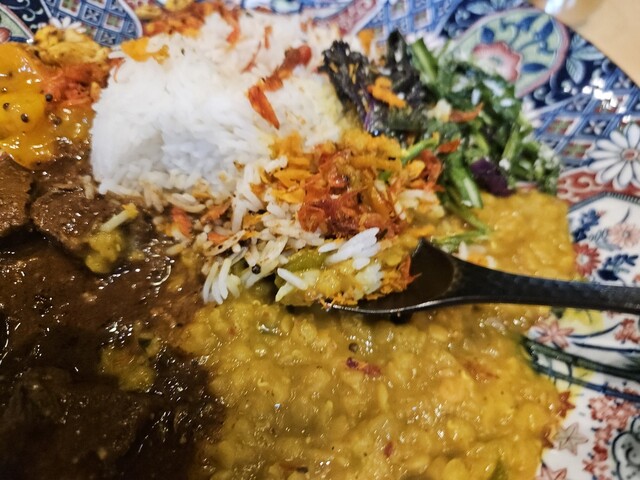 カレーは、スリランカポークとカダラパリップ(ヒヨコ豆)。「カレーは、お代わりできますよ~」と嬉しい声掛けが店主から。